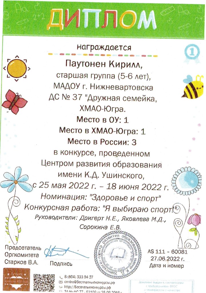 Конкурс Центра развития образования имени К.Д.Ущинского, номинация "Здоровье и спорт", 2022г. Паутонен К. |
