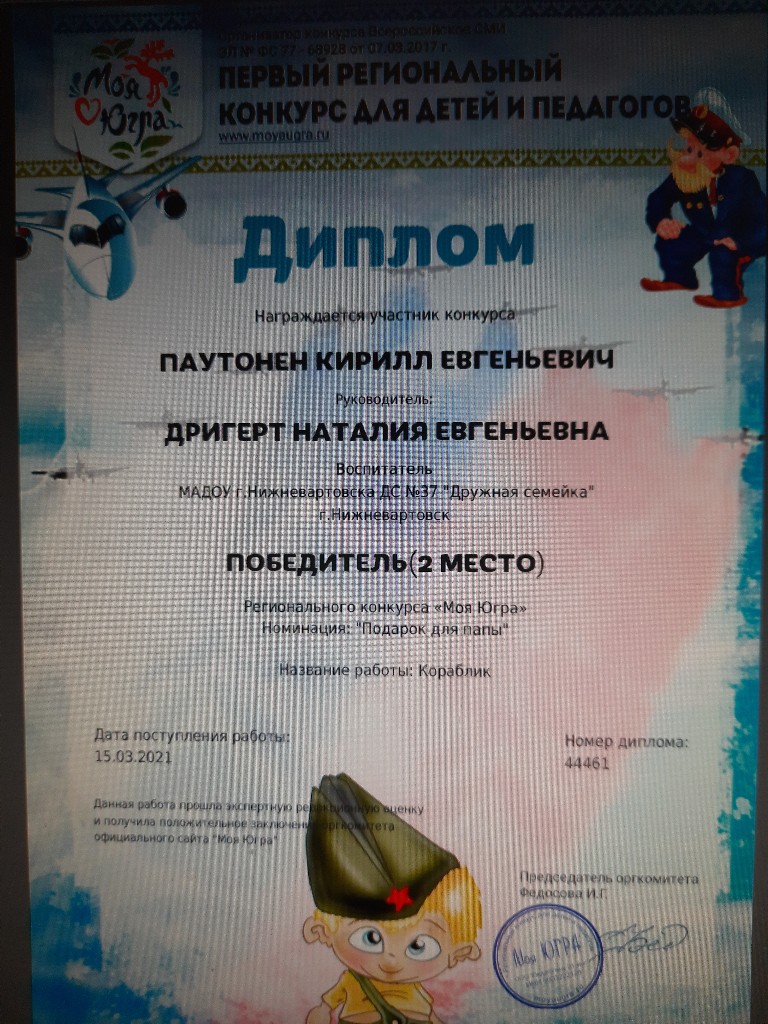 Диплом, 2 место, Региональный конкурс "Моя Югра", Номинация "Подарок для папы", 2021г., Паутонен К. |