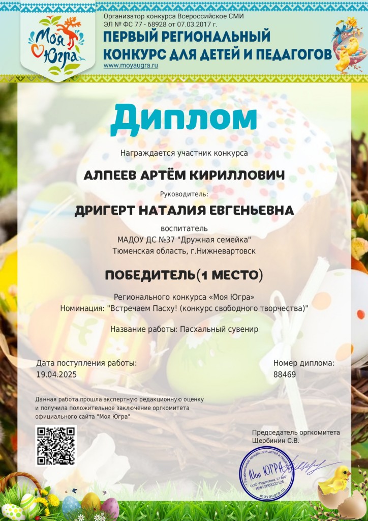 Диплом 1 место, Региональный конкурс "Моя Югра", номинация "Встречаем Пасху", апр.2025г., Алпеев А., заочно |