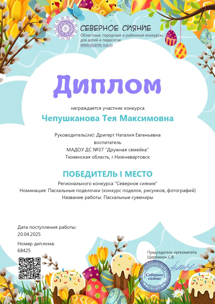 Диплом 1 место, Региональный конкурс "Северное сияние", номинация "Пасхальные поделочки", апр.2025г., Чепушканова Т., заочно |