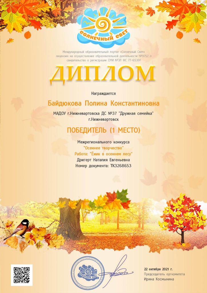 Диплом, 1 место, Межрегиональный конкурс "Осеннее творчество", 2021г., Байдюкова П. |