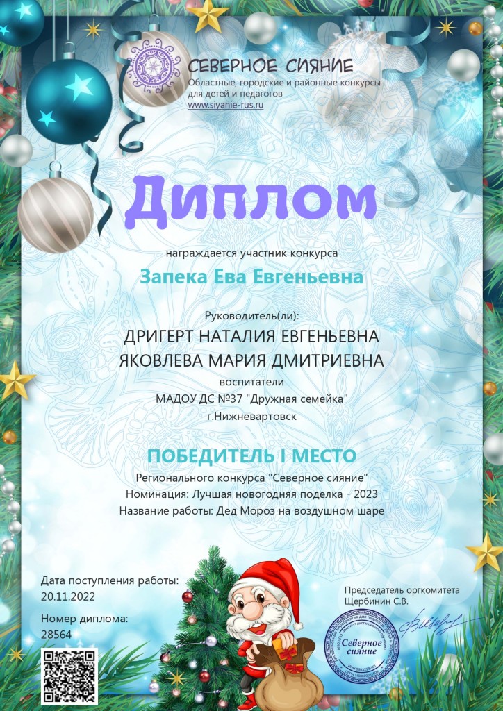 Диплом 1 место, Региональный конкурс "Северное сияние", Номинация "Лучшая новогодняя поделка -2023", 2022г.,Запека Е. |