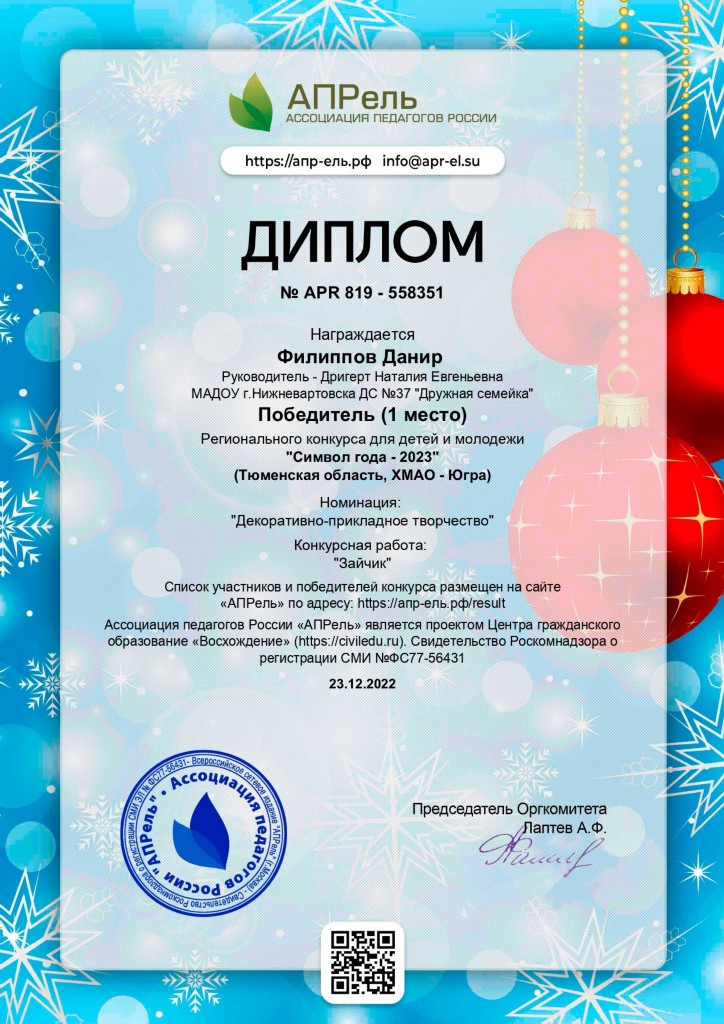 Диплом, 1 место, Региональный конкурс "Символ года-2023", 2022г., Филиппов Д. |