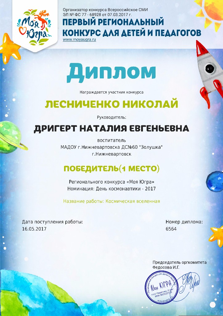 Диплом, 1место, Региональный конкурс "Моя Югра", Номинация "День космонавтики -2017", 2017г. Лесниченко Н. |