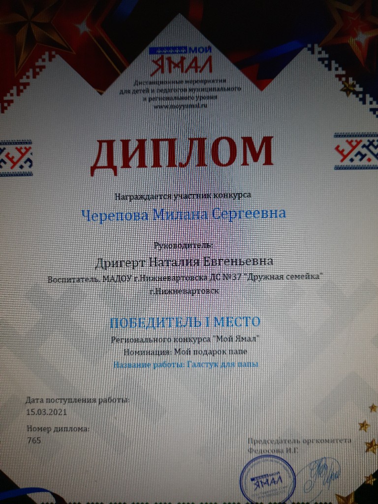 Диплом 1 место, Региональный конкурс "Мой Ямал", Черепова М., 2021г |