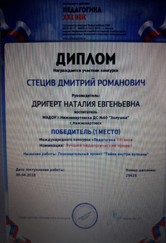Диплом, 1 место, Международный конкурс "Педагогика XXI век", Название работы "Познавательный проект "Тайна внутри вулкана", 2018г., Стецив Д. |