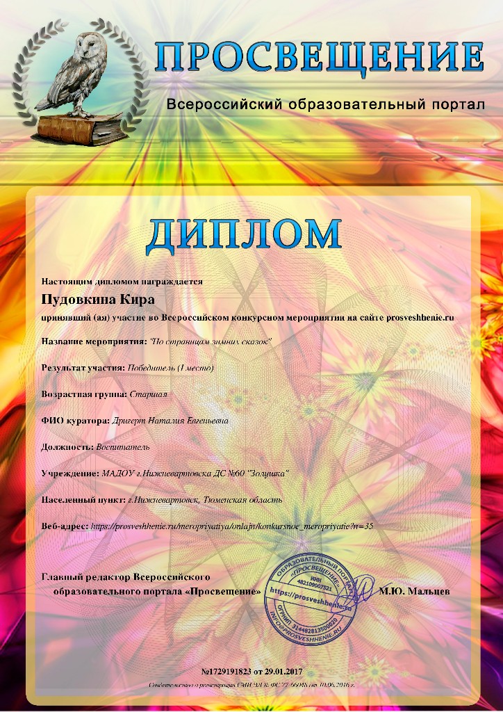 Диплом,1 место, Всероссийский конкурс "Просвещение", Викторина "По страницам зимних сказок", 2017г., Пудовкина К. |