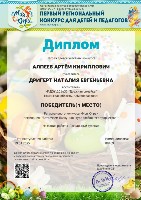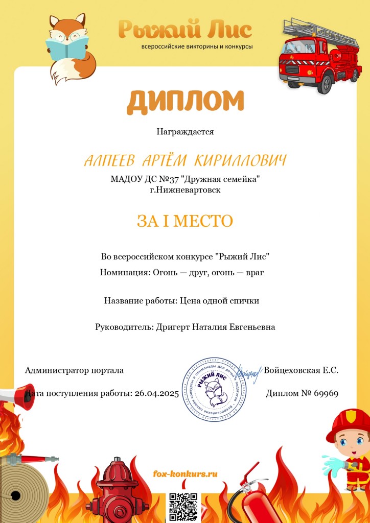 Диплом 1 место, Всерос.конкурс "Рыжий лис", номинация "Огонь-друг, огонь -враг", Алпеев А., апр. 2025г., заочно |