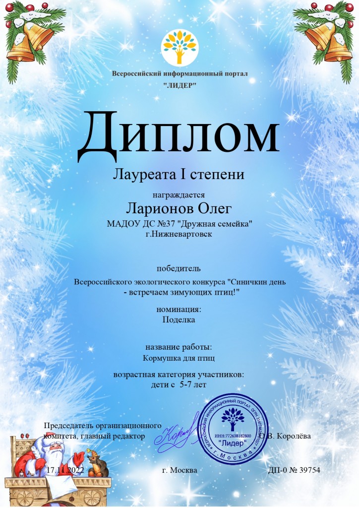 Диплом лауреата 1 степ., Всероссйский экологич.конкурс "Синичкин день - встречаем зимующих птиц!", номинация "Поделка", 2022г., Ларионов О. |