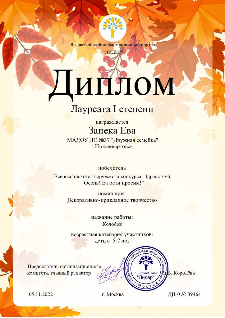 Диплом лауреата 1 степ., Всероссийский творч.конкурс "Здравствуй, осень! В гости просим!", Номинация "Декоративно-прикладное творчество", 2022г. Запека Е. |
