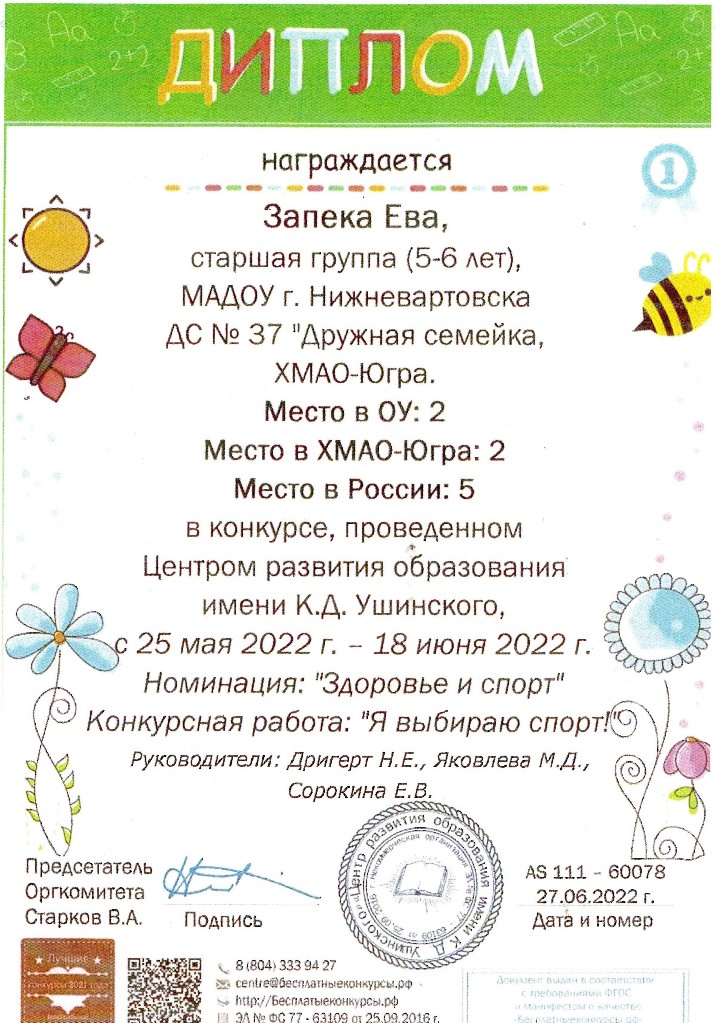 Конкурс Центра развития образования имени К.Д.Ущинского, номинация "Здоровье и спорт", 2022г. Запека Е. |