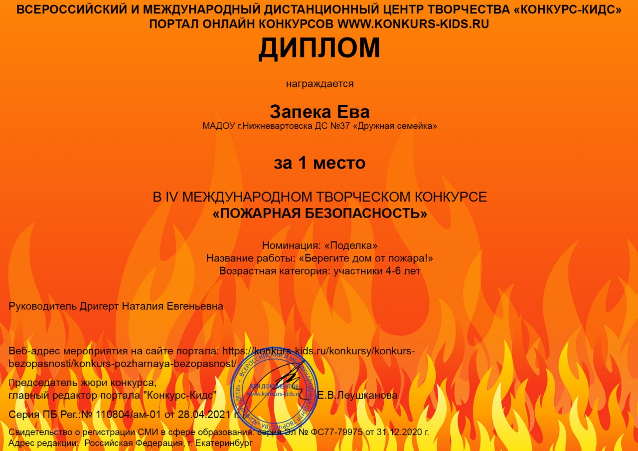 Диплом, 1 место, Международный творческий конкурс "Пожарная безопасность", Номинация "Поделка", 2021г., .Запека Е. |