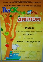 Диплом I степени, Всероссийский интеллектуальный турнир способностей "РостОК-UnikУм"среди детей 5-6 лет, Дададжанов Х., 2025г., очно |